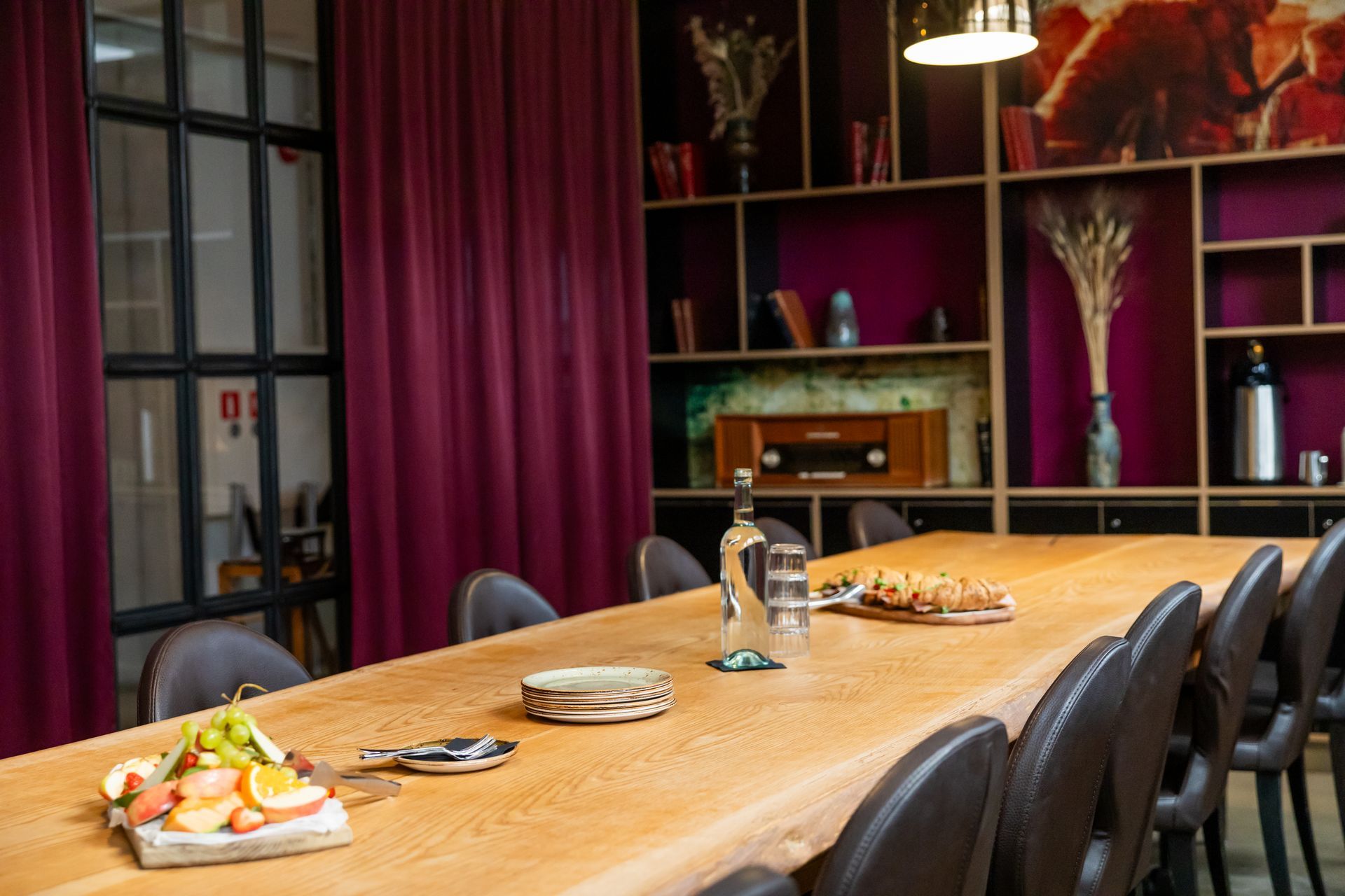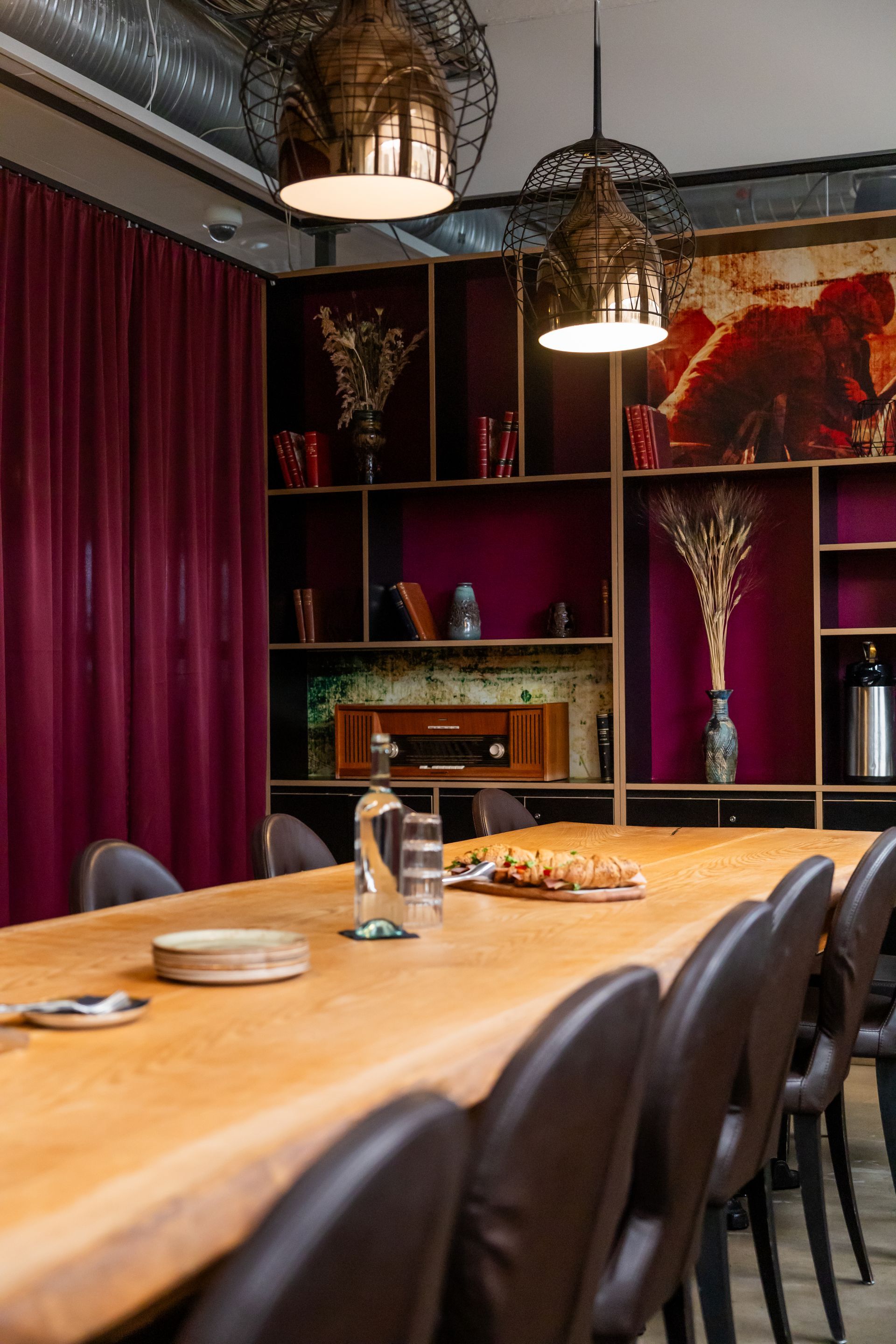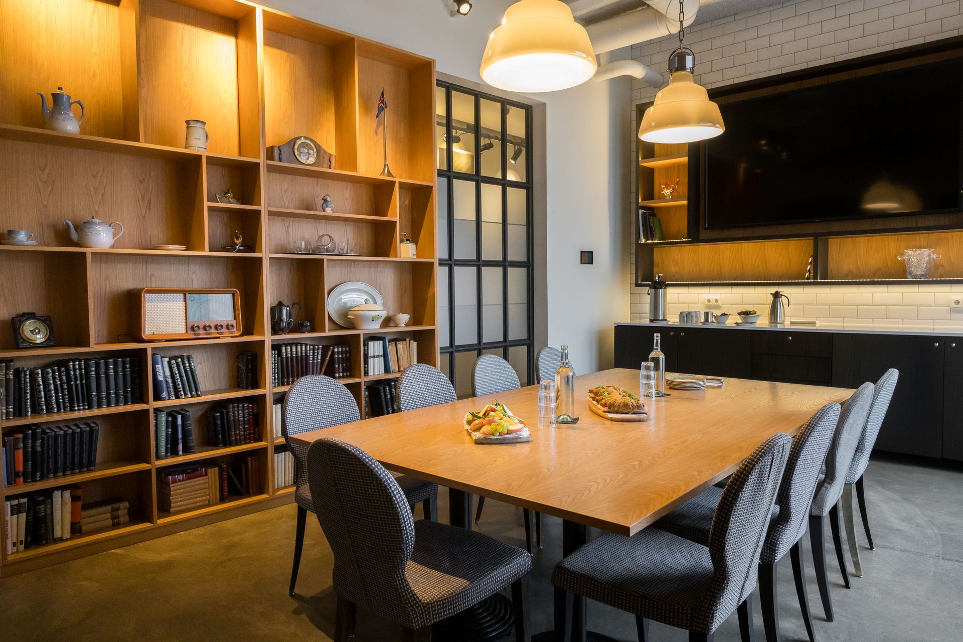 Óhefðbundin fundaraðstaða sem skapar stemningu og veitir innblástur. Hægt er að velja hvort herbergið er hólfað af eða hvort flæði sé á milli tveggja rýma með því að snúa bókahilluvegg. Í rýminu er flatskjár sem hægt er að tengja fyrir fundi og kynningar.