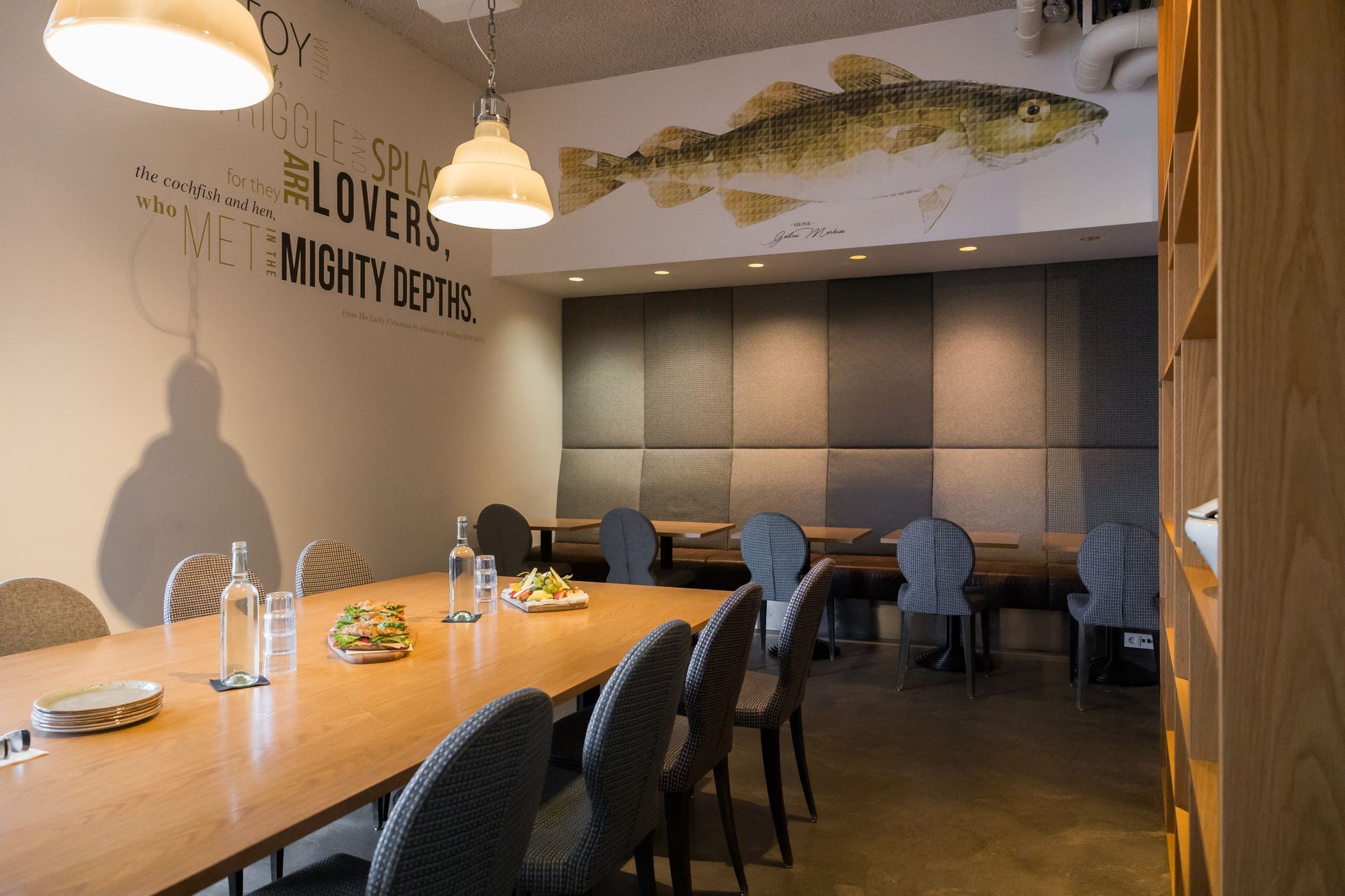 Langt og stæðilegt viðarborð sem tekur 20-22 manns í fundarsæti. Rýmið er staðsett á veitingahúsinu, Slippbarnum, og hentar einstaklega vel fyrir einkasamkvæmi, fundi og viðburði. Hægt er að loka rýminu með glerrennihurðum og tjöldum sem veita gott næði.